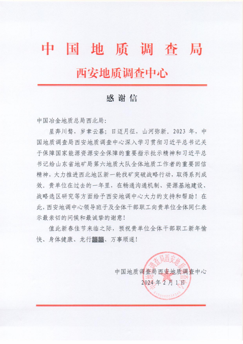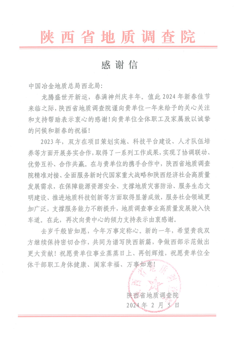 2024年新春佳節來臨之際,我局(公司)陸續收到中國地質調查局西安地質調查中心、陜西省地質調查院等地勘行業相關單位發來的感謝信,對我局(公司)在大力推進西北地區新一輪找礦突破戰略行動中,在資源基地建設、戰略選區研究、科技平臺建設、人才隊伍培養等方面給予的大力支持和幫助表示感謝。